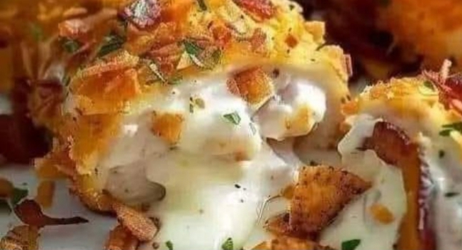 The Ultimate Crunchy, Creamy, Cheesy Dinner That’ll Blow Your Mind!If you’re looking for a recipe that screams comfort food with a bold, fun twist — this Cream Cheese & Bacon Stuffed Doritos Chicken will hit every craving you didn’t even know you had. It’s juicy on the inside, crunchy on the outside, and bursting with smoky bacon and creamy cheese goodness.Whether you’re cooking for family, friends, or just treating yourself, this dish guarantees that silence at the table moment when everyone’s too busy enjoying every bite.🛒 Ingredients Breakdown & What They Do🍗 Chicken Breasts (4 pieces)The base of the recipe — boneless, skinless chicken breasts are perfect for stuffing and bake evenly. Make sure they’re thick enough to butterfly and fill with the creamy mixture.🧂 Salt & PepperThe simplest yet most important seasoning to enhance all the flavors.🧀 Cream Cheese (4 oz, softened)Creates that rich, velvety filling that melts beautifully inside the chicken. The softness makes it easy to mix and stuff.🧀 Shredded Cheddar Cheese (½ cup)Adds sharp, cheesy flavor and helps the filling stay gooey and satisfying when baked.🥓 Bacon (4 slices, cooked and crumbled)Because everything tastes better with bacon! It adds smoky flavor, salty crunch, and a savory kick to the creamy filling.🔥 Crushed Doritos (1 cup)The star of the coating! Doritos give the chicken that iconic crunch and a bold flavor twist. Choose your favorite flavor — Nacho Cheese for classic, Cool Ranch for tangy, or Spicy Sweet Chili for a kick.🥚 Eggs (2, beaten)The eggs help the crushed Doritos stick firmly to the chicken, creating that crispy crust.🫒 Olive Oil (1 tbsp)Used to lightly grease the baking dish to prevent sticking and help with even browning.👩🍳 Step-by-Step MethodPrep the Oven and DishPreheat your oven to 375°F (190°C). Lightly grease your baking dish with olive oil — this keeps the coating from sticking and helps it crisp nicely.Butterfly the ChickenPlace a chicken breast flat on a cutting board. Using a sharp knife, carefully slice horizontally to create a pocket, being sure not to cut all the way through. Repeat for all four breasts.Season the ChickenSprinkle a bit of salt and pepper inside and outside each piece for flavor from the inside out.Make the Creamy FillingIn a small bowl, mix the softened cream cheese, shredded cheddar, and crumbled bacon until smooth and evenly combined.Stuff the ChickenSpoon the cream cheese mixture into each chicken pocket. Don’t overfill — just enough to close the edges by pressing gently.Coat with DoritosCrush your Doritos (you can use a food processor or a zip bag and rolling pin). Dip each stuffed chicken breast into the beaten eggs, then coat generously with the crushed Doritos, pressing gently so they stick well.Bake to Crispy PerfectionPlace the coated chicken breasts in the prepared dish and bake for 25–30 minutes until golden, crunchy, and cooked through (internal temperature should reach 165°F / 74°C).Rest and ServeLet the chicken rest for a few minutes before serving so the filling can settle and stay creamy.💡 Pro Tips for SuccessUse thick chicken breasts so they’re easy to stuff without tearing.Soften the cream cheese fully — it mixes smoother and spreads easily.Don’t crush Doritos too fine; you want texture for that extra crunch.Add spice: Mix chili flakes or hot sauce into the filling for extra heat.Air fryer option: Cook at 375°F (190°C) for about 18–20 minutes for an ultra-crispy crust.🍴 Serving SuggestionsServe with a fresh garden salad or coleslaw to balance the richness.Pair with mashed potatoes, corn on the cob, or fries for comfort food heaven.Drizzle with ranch dressing, BBQ sauce, or spicy mayo for an extra burst of flavor.Turn it into a sandwich or wrap for next-day leftovers — it’s even better cold!🧾 Nutritional Information (per serving, approx.)Nutrient AmountCalories 420 kcalProtein 35 gFat 25 gCarbohydrates 12 gSugar 2 gSodium 480 mg(Values may vary based on Doritos flavor and cheese type used.)❓ Frequently Asked Questions (FAQ)Q1: Can I use flavored cream cheese?Absolutely! Try chive and onion or jalapeño cream cheese for a flavor boost.Q2: Can I use chicken thighs instead of breasts?Yes, but they’re smaller — so use less filling and adjust cooking time to 20–25 minutes.Q3: What flavor of Doritos works best?Nacho Cheese is the classic choice, but Cool Ranch or Spicy Sweet Chili add a unique twist!Q4: Can I prepare it ahead of time?Yes! You can stuff and coat the chicken up to 12 hours ahead and refrigerate. Bake right before serving.Q5: Can I freeze it?Yes. Freeze uncooked stuffed chicken on a tray, then store in airtight bags. Bake from frozen at 375°F for 35–40 minutes.🌟 Why Everyone Loves This RecipeCombines creamy, crispy, cheesy, and smoky all in one biteUses simple ingredients but delivers restaurant-quality flavorPerfect for family dinners, potlucks, or game nightsFun and creative twist on classic stuffed chickenIn short: This Cream Cheese & Bacon Stuffed Doritos Chicken is comfort food with personality — bold, creamy, crunchy, and totally addictive. Try it once, and it might just become your signature dinner dish!