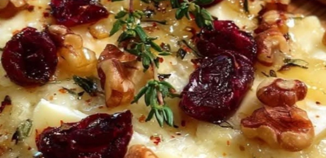 Looking for an appetizer or light meal that’s sweet, savory, creamy, crunchy, and a little spicy — all in one bite? This Crispy Flatbread with Brie, Cranberries, and Toasted Walnuts, finished with a hot honey drizzle, is the perfect choice. Ideal for gatherings, wine nights, or cozy evenings, this dish brings gourmet flair with minimal effort.🧀 Ingredients Breakdown🔸 Flatbread or NaanThis forms the base. Flatbread is a versatile canvas — use store-bought naan, pita, or any pre-baked flatbread. Look for something sturdy enough to hold toppings without getting soggy.🔸 Brie Cheese (4 oz)Brie melts beautifully and adds a creamy, rich flavor that pairs exceptionally well with sweet and crunchy toppings. If you prefer, Camembert or triple-cream cheeses can be substituted.🔸 Dried Cranberries (1/3 cup)These add a tart-sweet note and a chewy texture that balances the rich brie. You can also try dried cherries or figs for variation.🔸 Toasted Walnuts (1/4 cup)Toasting brings out the nutty aroma and enhances the crunch. Feel free to swap with pecans, almonds, or hazelnuts.🔸 Olive Oil (1 tbsp)Used to brush the flatbread, helping it crisp up and preventing sogginess from the toppings.🔸 Fresh Thyme (1/2 tsp)A subtle, earthy herb that complements both the cheese and sweet elements. Dried thyme works too, but use a little less.🔸 Salt & Black PepperFor seasoning and enhancing flavor.🔸 Hot Honey DrizzleHoney (2 tbsp): The sweetness ties everything together.Red Pepper Flakes (1/4 tsp): Adds a gentle kick. You can adjust this depending on your heat preference.👨🍳 Method of Preparation✅ Step 1: Prep the OvenPreheat your oven to 400°F (200°C). Line a baking sheet with parchment paper to avoid sticking and for easy cleanup.✅ Step 2: Build the FlatbreadPlace your flatbread on the baking sheet and brush lightly with olive oil.✅ Step 3: Add the BrieArrange thin slices of Brie evenly over the flatbread. Try to cover most of the surface so every bite gets that creamy goodness.✅ Step 4: Add the ToppingsSprinkle the dried cranberries and toasted walnuts over the cheese. Follow with fresh thyme, a light touch of salt, and black pepper.✅ Step 5: BakePlace in the preheated oven and bake for 8–10 minutes, or until:The Brie has melted and started to bubbleThe edges of the flatbread are golden and crisp✅ Step 6: Make the Hot HoneyWhile the flatbread bakes, heat honey and red pepper flakes in a small saucepan over low heat for 1–2 minutes. Don’t boil — just warm to infuse the flavors.✅ Step 7: Drizzle & ServeRemove the flatbread from the oven and immediately drizzle with hot honey. Slice into pieces and serve while warm.❓ Frequently Asked Questions (FAQ)Q: Can I make this flatbread ahead of time?A: You can prep the toppings and even assemble the flatbread a few hours in advance. Bake and drizzle right before serving for the best texture.Q: What can I use instead of Brie?A: Try Camembert, goat cheese, gorgonzola (for a funkier flavor), or even shredded mozzarella for a milder version.Q: Is hot honey spicy?A: It has a subtle heat that complements the sweetness. You can make it as mild or spicy as you like by adjusting the red pepper flakes.Q: Can I make this gluten-free?A: Yes! Just use a gluten-free flatbread or pizza crust base.Q: How should I toast the walnuts?A: Spread them in a dry pan over medium heat for 3–5 minutes, shaking often. Or bake at 350°F (175°C) for about 8 minutes.🥂 Serving SuggestionsWine Pairing: This dish pairs well with a crisp white wine like Sauvignon Blanc or Chardonnay, or even a sparkling Prosecco.Salad Companion: Serve with an arugula or spinach salad with balsamic vinaigrette.Party Appetizer: Cut into small squares for cocktail parties or cheese boards.🔁 VariationsAutumn twist: Add thin apple or pear slices before baking.Savory upgrade: Add a few slices of prosciutto or pancetta.Veggie touch: Add caramelized onions or roasted butternut squash.📋 Nutrition Info (per slice, approx.)Calories: 260Protein: 7gFat: 16gCarbohydrates: 22gFiber: 2gSugars: 8g(Note: Values may vary depending on exact ingredients used.)🧡 Final ThoughtsThis flatbread is a beautiful harmony of flavors: creamy Brie, tart cranberries, crunchy walnuts, and that sweet-spicy hot honey drizzle. Whether you’re entertaining guests or just treating yourself, it’s an effortless way to bring restaurant-level flair to your table in under 20 minutes.
