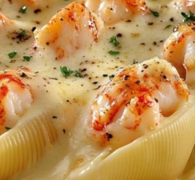 · If using, add the white wine and let it simmer for 2 minutes until reduced slightly.· Whisk in the heavy cream, stock, lemon juice, and a pinch of red pepper flakes (if using). Bring to a gentle simmer and let it cook for 3-4 minutes until it slightly thickens.· Remove from heat and stir in the fresh parsley. Season with salt and pepper to taste. Set aside.3. Make the Lobster Filling:· In a large bowl, combine the ricotta, cream cheese, Parmesan cheese, and beaten egg. Mix until smooth.· Gently fold in the chopped lobster meat, chives, parsley, and lemon zest.· Season carefully with salt and pepper. Taste and adjust seasoning. Be gentle to keep the lobster pieces intact.4. Assemble the Dish:· Preheat your oven to 375°F (190°C).· Spread about ½ cup of the garlic butter sauce evenly on the bottom of a 9×13 inch baking dish.· Take a cooked pasta shell in your hand and carefully fill it with a heaping tablespoon of the lobster mixture. Place it seam-side up in the prepared baking dish. Repeat with the remaining shells and filling.5. Bake:· Pour the remaining garlic butter sauce evenly over the top of the stuffed shells.· Sprinkle the shredded mozzarella and extra Parmesan cheese over the top.· Cover the dish tightly with aluminum foil and bake for 20 minutes.· Remove the foil and bake for an additional 5-10 minutes, or until the cheese is golden and bubbly and the filling is heated through.6. Serve:· Let the shells rest for 5-10 minutes before serving. They will be very hot!· Garnish with fresh chopped parsley or chives and serve immediately.—Chef’s Notes & Tips1. Lobster Meat: You can use freshly steamed lobster, high-quality pre-cooked lobster meat from the seafood counter, or even thawed frozen lobster tails or claw meat. For a more budget-friendly version, you can substitute half the lobster with large shrimp (prawns) or scallops.2. Wine Substitute: If you prefer not to cook with wine, you can simply omit it. Use an additional ¼ cup of chicken or seafood stock instead.3. Make Ahead: This is a great dish for entertaining. You can assemble the entire dish up to a day in advance. Cover tightly and refrigerate. When ready to bake, you may need to add 5-10 minutes to the covered baking time since it will be cold from the fridge.4. Preventing Dry Shells: The sauce on the bottom and over the top is crucial. It steams the shells and keeps everything moist and flavorful during baking. Don’t skip it!5. Serving Suggestion: This is a rich dish. Serve it with a simple green salad with a light vinaigrette and some crusty bread to soak up the incredible garlic butter sauce.Enjoy your incredibly delicious and impressive meal