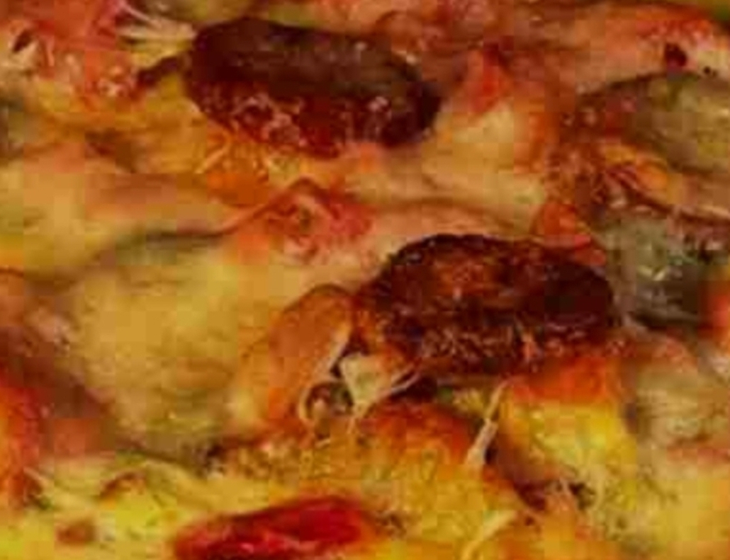 • Add a layer of tomato slices and hunting sausages.
